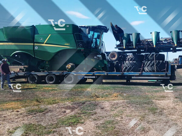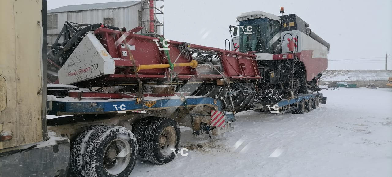 Перевозка комбайна с жаткой силами нашей компании осуществляется на трале подходящей длины. Высота погрузки на такое оборудование составляет 0,9 м. Для погрузочно-разгрузочных работ мы используем кран. Ещё одна особенность: перед тем, как перевозить груз, мы демонтируем колёса сельхозмашины и помещаем их под жатку.
